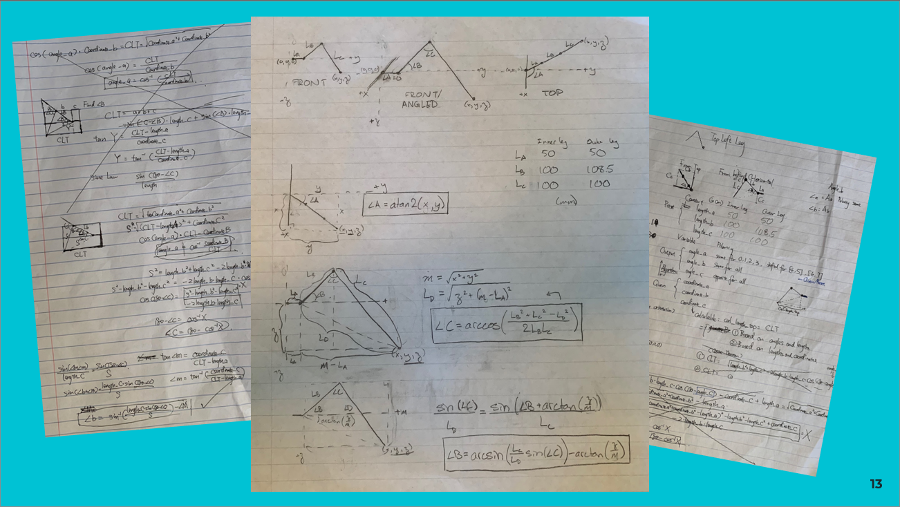 Each of Spooder’s legs has three joints that need precise angle calculations to place the foot at any desired position in 3D space. We used the law of cosines and law of sines to solve this—treating each leg as a series of triangles. Daniel and I ported the IK algorithms from Spidy, optimizing them for the BeagleBone Blue’s real-time performance requirements. Getting this math wrong meant legs would move in completely wrong directions, which happened plenty of times during development.